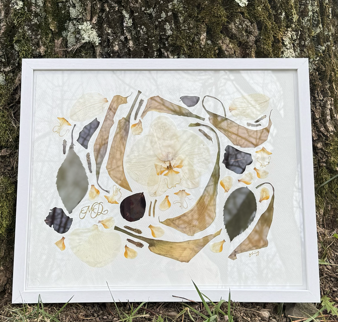 8x10in white wood frame. Block print inspired, pressed marigold flowers.